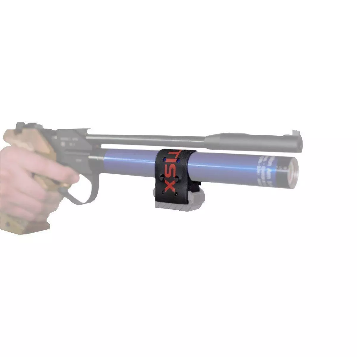 Cet adaptateur de rail est conçu pour être fixé sur le cylindre à air d'un pistolet à air comprimé de compétition à l'aide de la sangle élastique fournie. Cela permet de fixer le MantisX (non fourni) à votre pistolet de compétition.