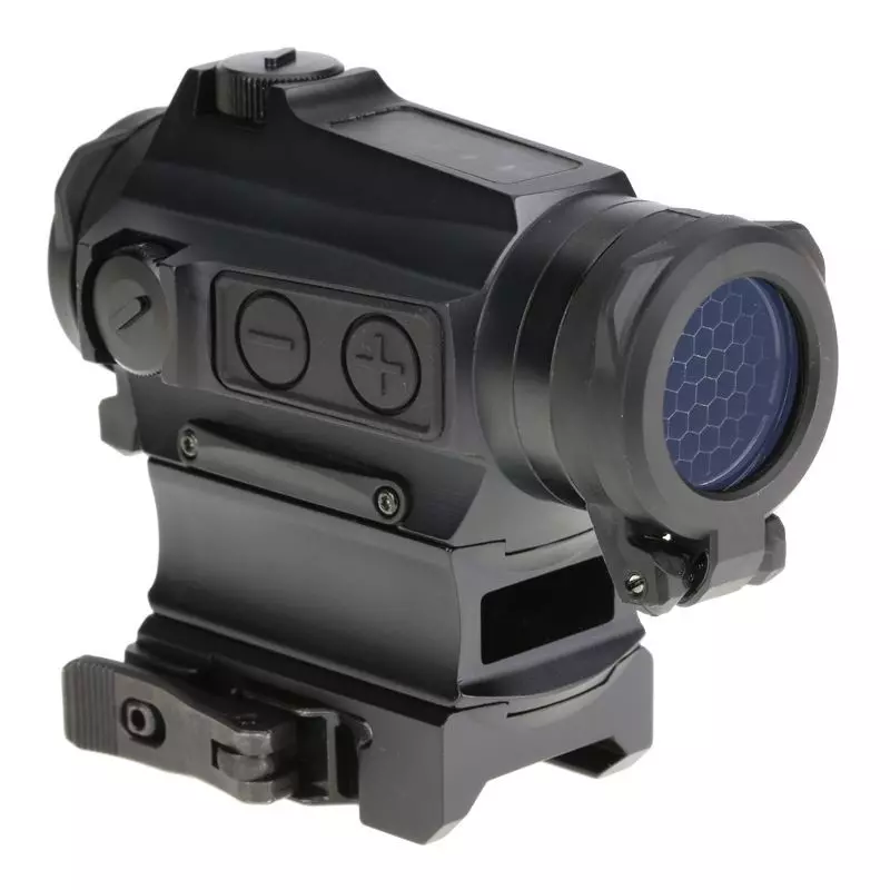 Le réticule est de 2 MOA Dot et 65 MOA vert. Le MRS vous permet de commuter entre le 2 MOA Dot ou 65 MOA et 2 MOA Dot. Vous pouvez régler la luminosité du réticule sur 12 intensités différentes dont 2 en visions nocturnes. Le diamètre de l'optique est de 20mm.