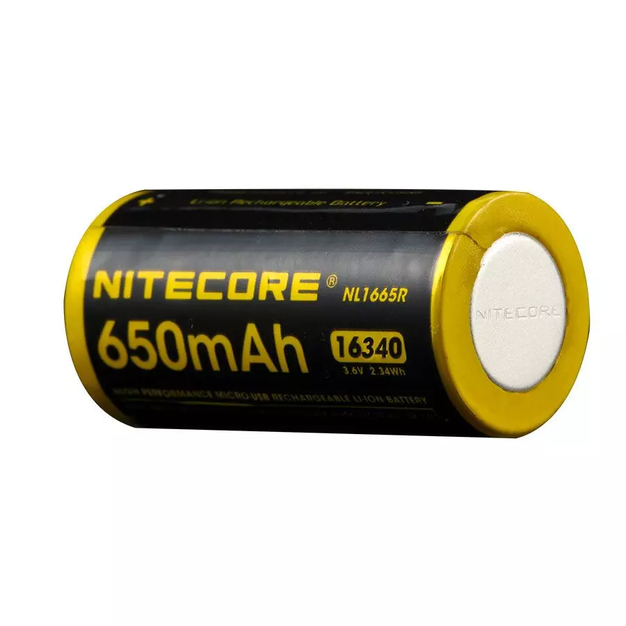 La batterie Nitecore NL1665R est une batterie 16340 de 650mAh avec un chargeur intégré, ainsi vous pouvez la recharger sans un chargeur externe supplémentaire. Il suffit d'utiliser un câble USB vers micro USB vendu séparément. Elle peut évidement être rechargée dans un chargeur traditionnel.