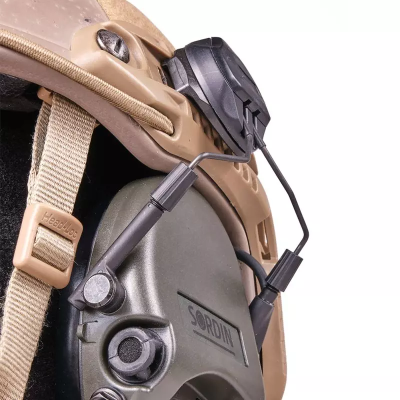 Le système de fixation ARC-rail Sordin permet de monter un casque anti-bruit Sordin sur sur casque tactique doté d'un rail.