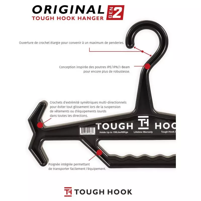 Les cintres Tough Hook sont conçus pour transporter jusqu'à 68 kilos de vêtements et équipements. Leur conception réversible leur permettent d'être suspendu par le crochet, mais également d'être transportés avec leur contenu par la poignée ergonomique.