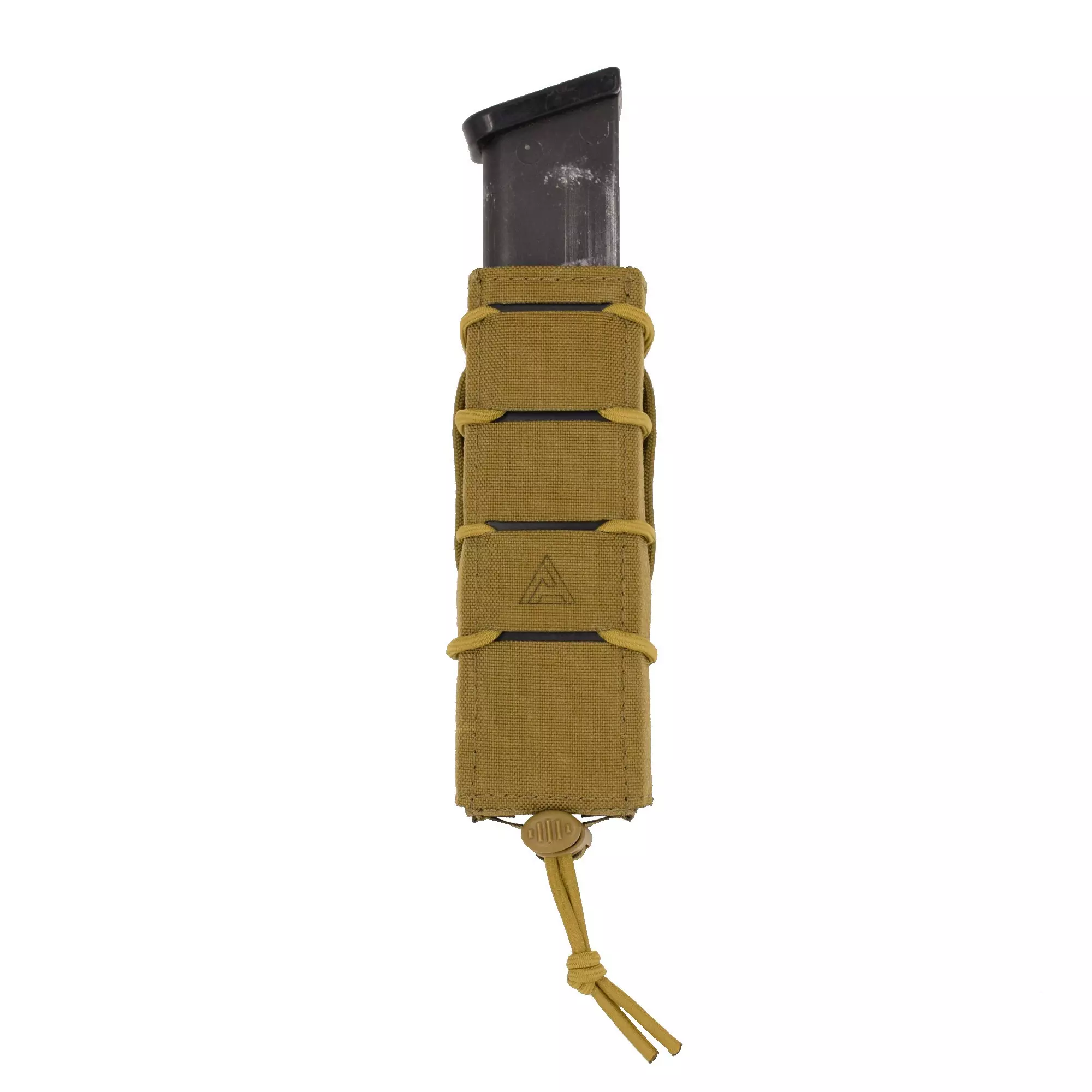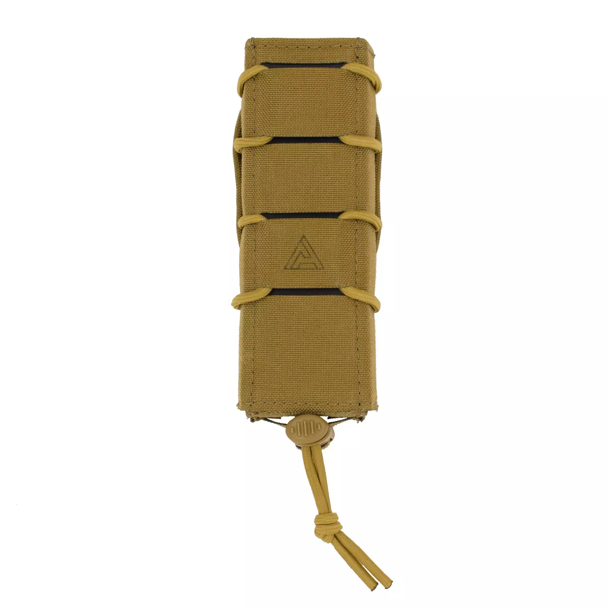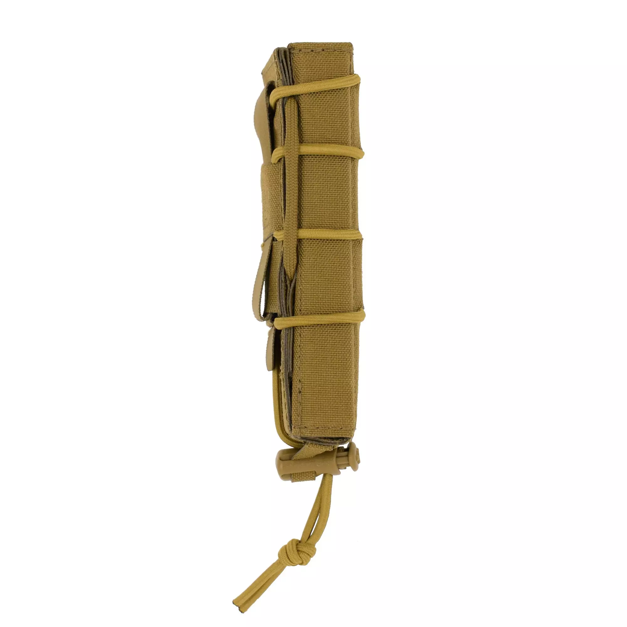 Cette poche pour chargeur longs ou bâton téléscopique (ou tout autre objet de taille similaire) est conçue pour les rechargements rapides tout en garantissant une rétention sécurisé. La matière intérieure de la poche ainsi qu'un élastique de réglage permettent au magasin de rester en place même lors de sauts ou de courses. Elle se fixe soit par système Molle soit à la ceinture grâce à deux paracordes latérales.