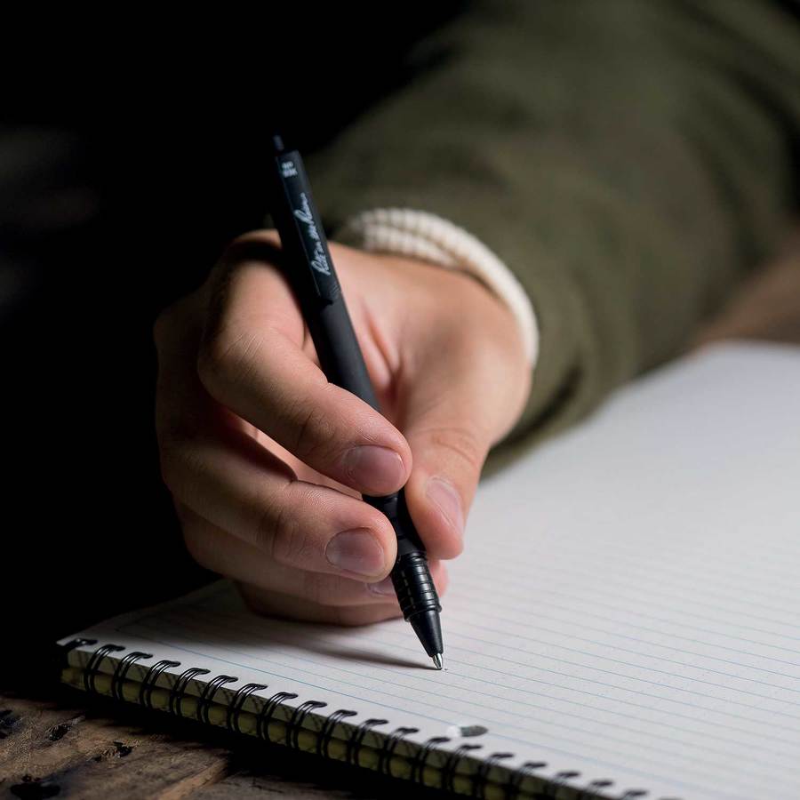 Stylo à bille noir Tout Temps en polymère sans bouchon, mine rétractable qui à la capacité d'écrire sur papier humide et à l'envers. L'encre brevetée et le système de distribution utilisés exclusivement dans les stylos Rite in the Rain écrivent sans s'effacer dans des conditions extrêmement humides.