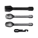 Constitué d'une spatule double face, d'une fourchette, d'une cuillière et d'un ouvre boite, le set ComplEAT se transporte en pince.