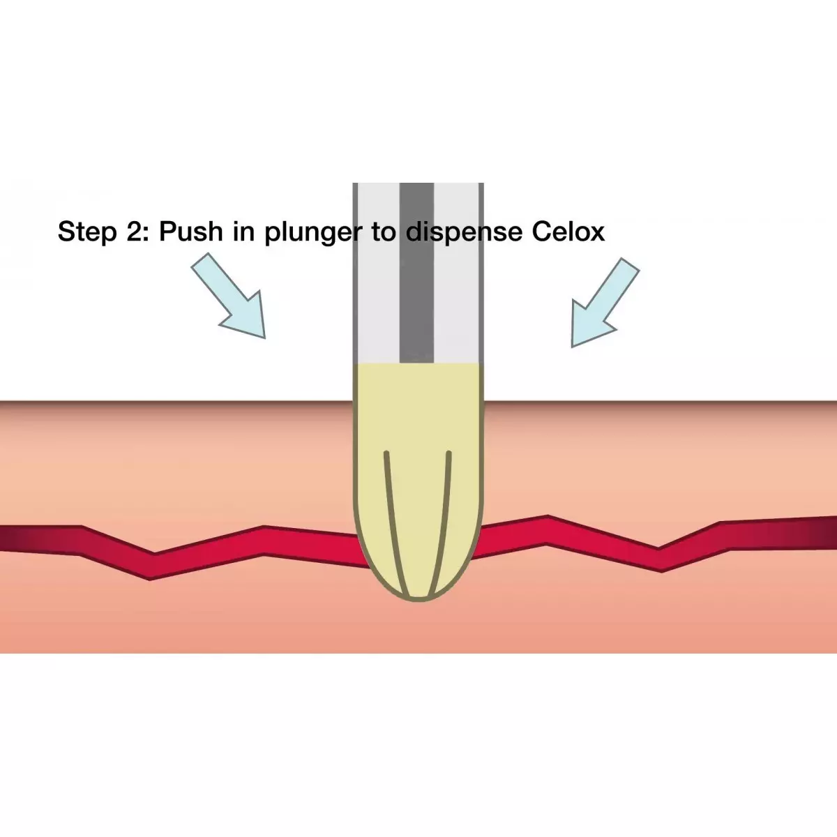 Ce produit est idéal pour les plaies difficiles d'accès (blessures par balle, couteau ou explosions) avec une ouverture trop étroite pour y glisser les granules ou des Celox Gaze. Ce produit à usage unique contient 6 grammes de granules hémostatiques et s'injecte directement dans la blessure.