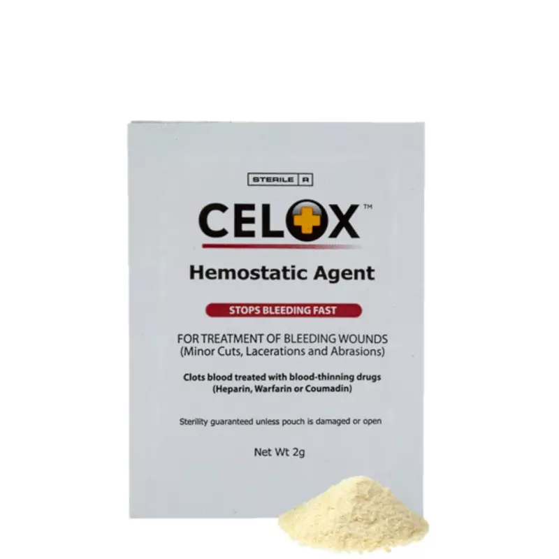 Le Celox se mélange au sang pour former un gel résistant en moins de 30 secondes, formant ainsi un caillot à la forme de plaie et limite ou arrête l'hémorragie. Les tests menés montrent l'efficacité du Celox même en situation d'hypothermie ou en présence de produits anticoagulants.