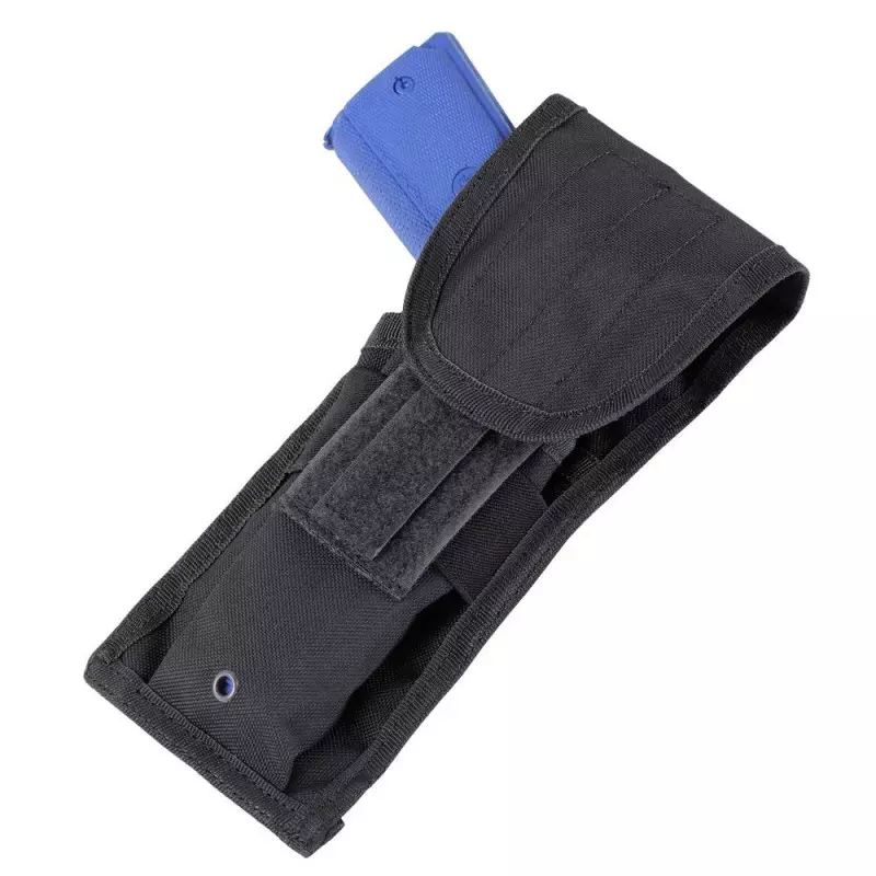 Poche pour arme de poing avec un large rabat auto-agrippant en plus de de la rétention par bouton pression.