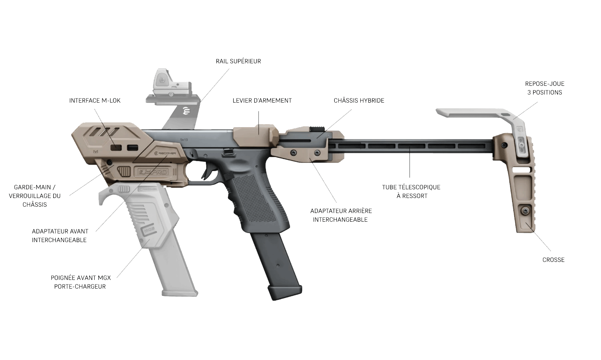 - Plateforme modulaire compatible multi-pistolets via adaptateurs (actuellement uniquement Glock 9mm et SW 40).