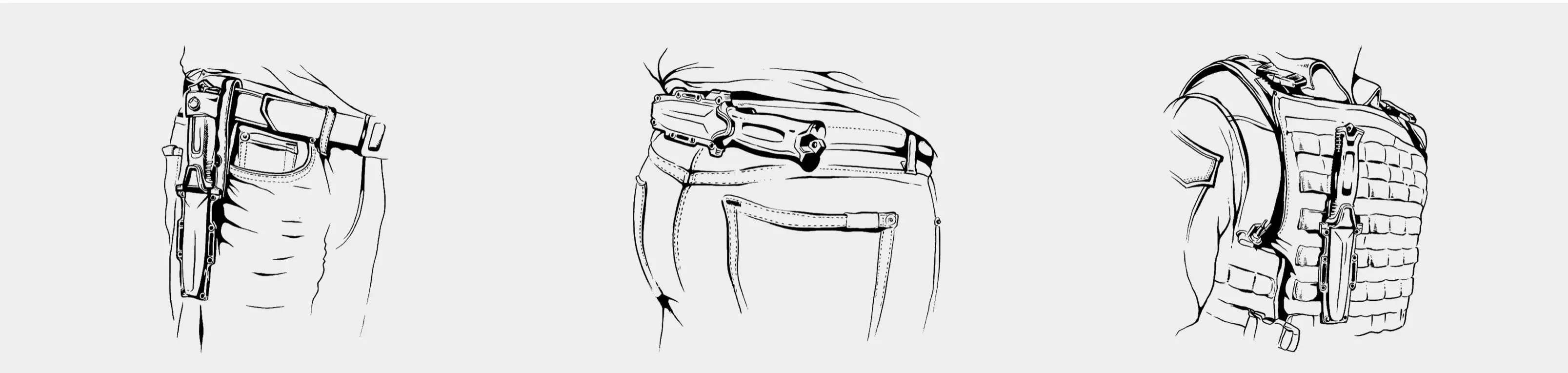 - 3 possibilités de portage avec l'étui : ceinture vertical, ceinture horizontal, sur passant molle verticalement