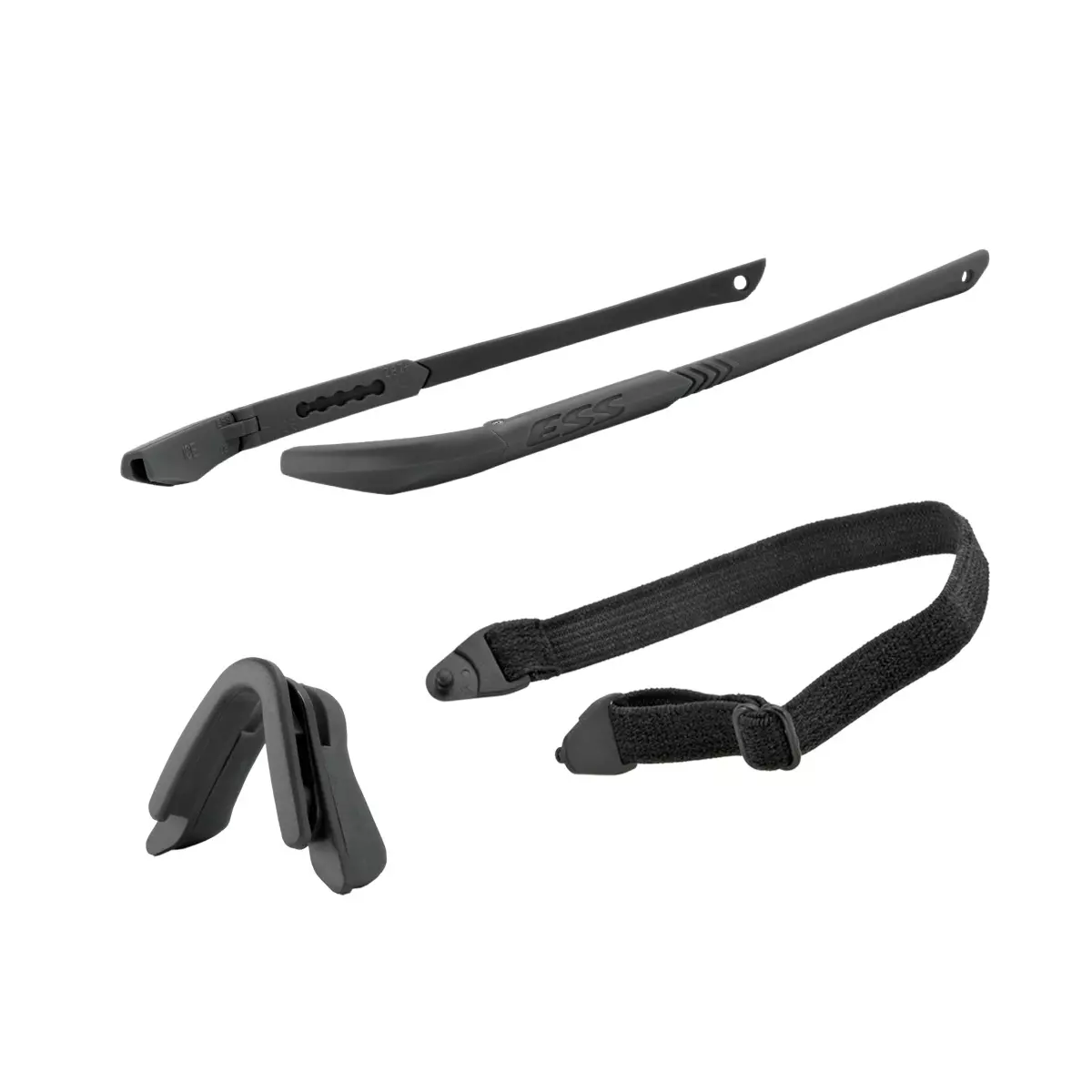Ensemble monture ICE™ de couleur noire complet (sans verre) comprenant la pièce nasale, les branches et l'élastique de rétention.