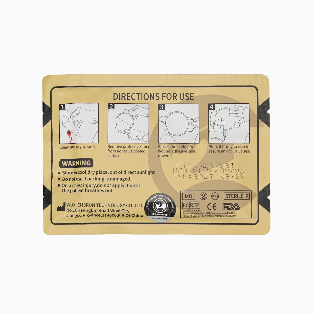 Le pansement compressif non ventilé Rhino Rescue fournit une étanchéité complète pour les blessures nécessitant une fermeture totale, empêchant l’entrée et la sortie d'air ou de contaminants dans la plaie.