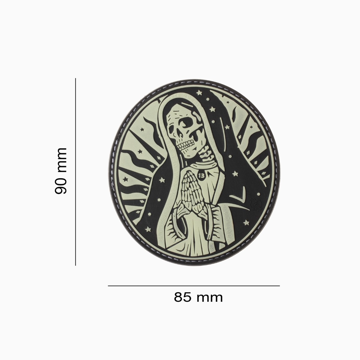 Le patch Santa Muerte de Jacket To Go offre un niveau de détail remarquable en PVC 3D et est disponible en Phosphorescent (glow in the dark) pour une signature visuelle unique. Conçu en PVC flexible de haute qualité, il résiste durablement aux intempéries et se fixe facilement grâce à son dos velcro.