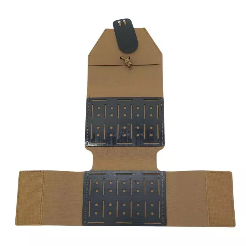 • Constitué d'une partie fixe MOLLE partiellement élastique dans laquelle est glissé la poche interne garnie de matériel médic.