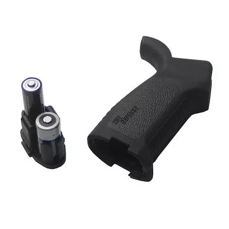 La poignée s'ouvre par le dessous afin de pouvoir y stocker des batteries.