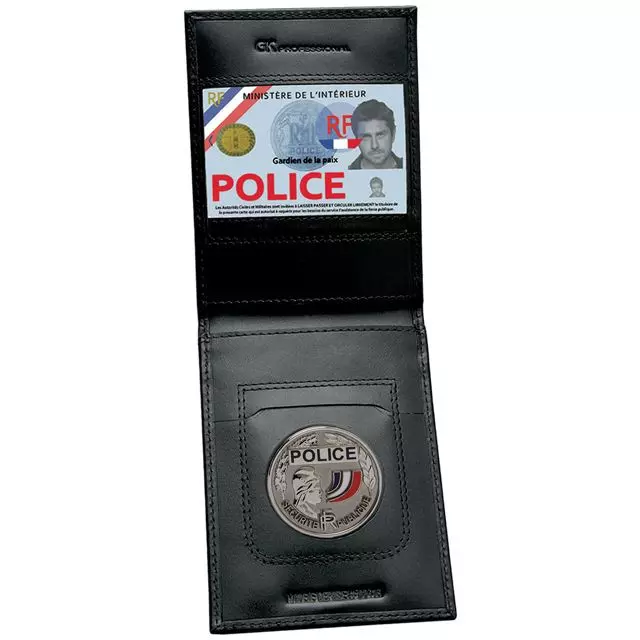 Ce porte-cartes permet le port d'une médaille, d'une carte professionnelle et d'une carte de transport type Navigo sur l'extérieur d'un volet.