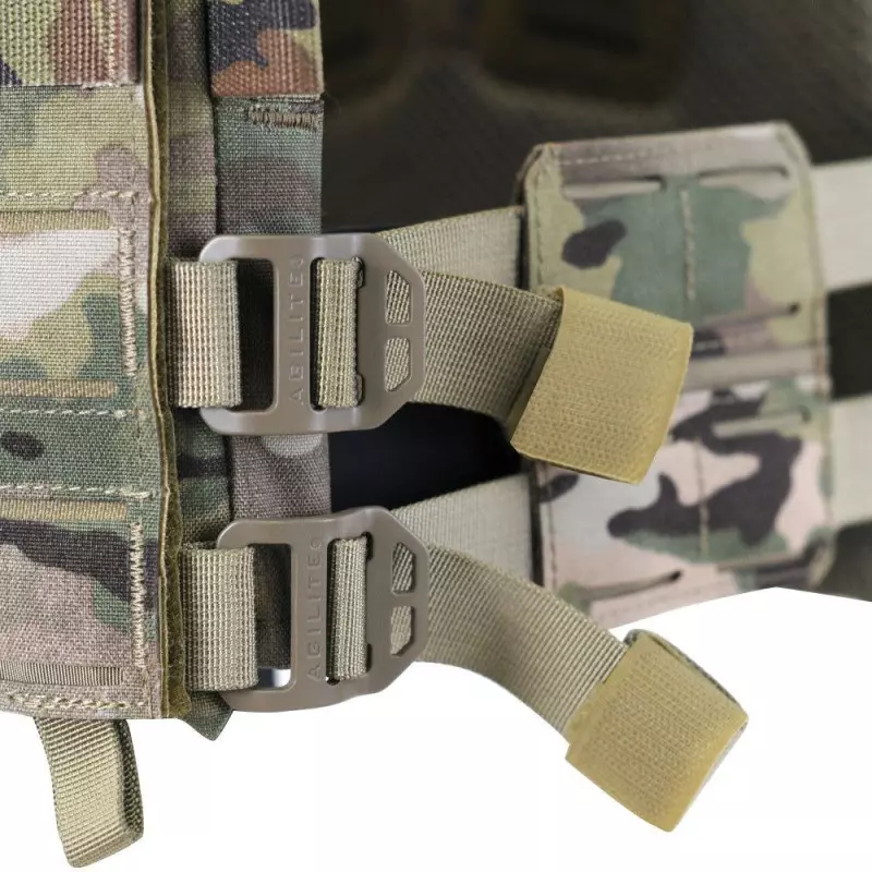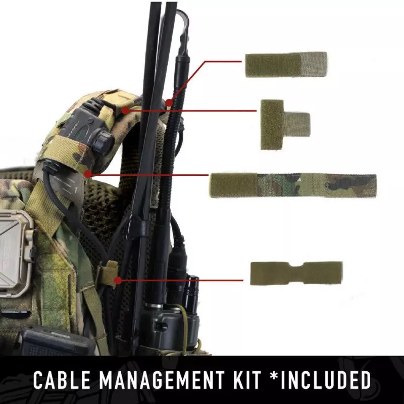 • La ceinture cummerbund low profile se fixe par velcro ou par boucles de dégagement rapide (non incluses, bientôt disponible), elle peut être remplacée par le cummerbund Warfighter (non inclus, bientôt disponible) afin d'augmenter l'emport latéral.