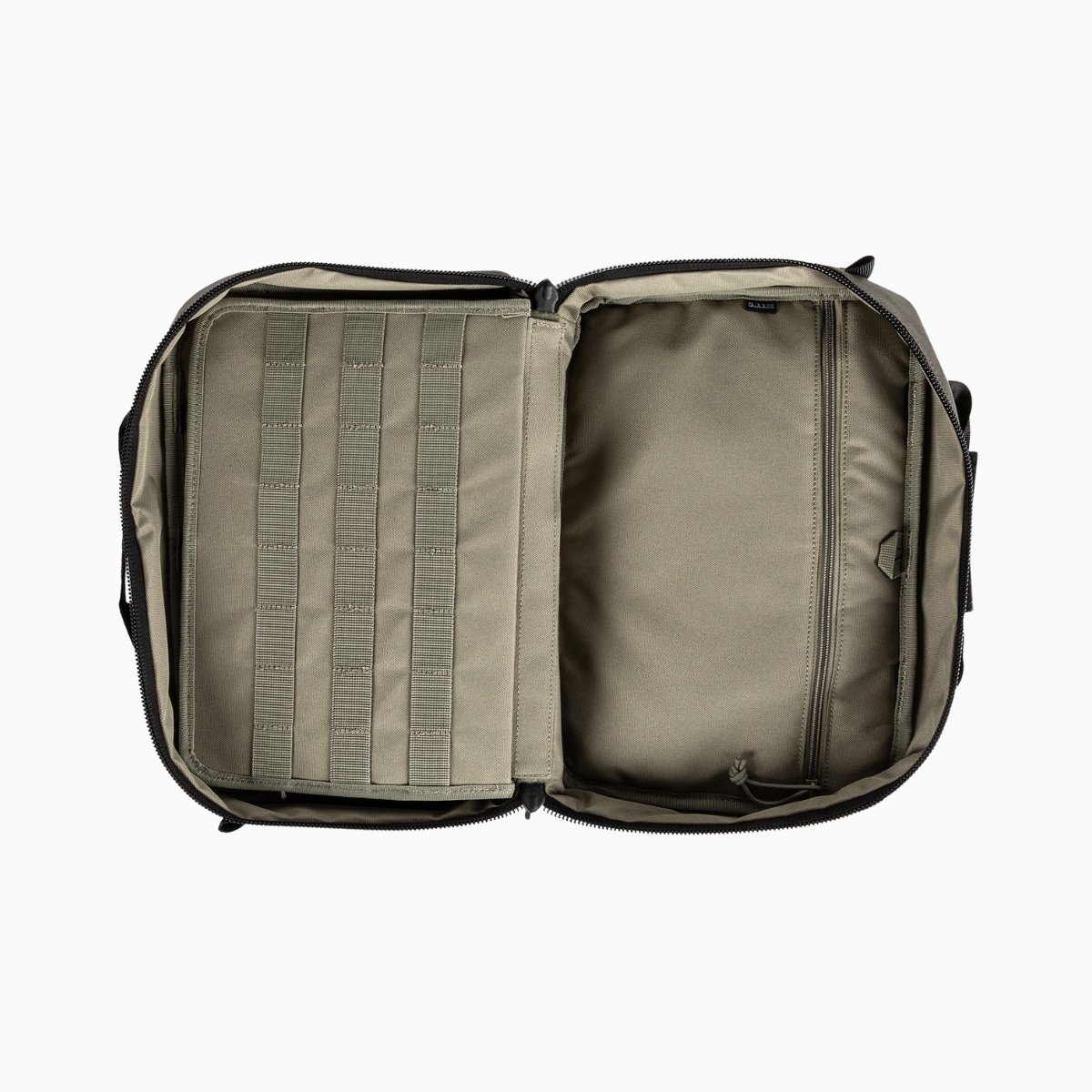 • Séparateur amovible avec des bandes élastiques (5 larges élastiques) et un panneau MOLLE en toile. Il peut être maintenu sur l'une ou l'autre des parois du compartiment grâce à un crochet dédié.