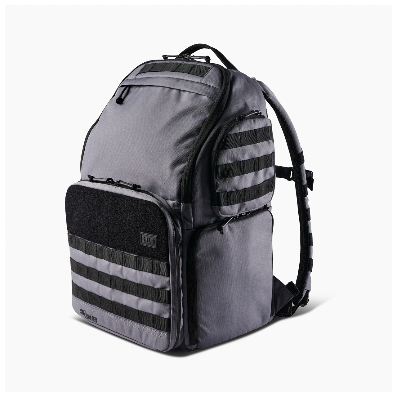 5.11 Tactical x Sig Sauer : Un sac à dos pour le tir coloris Gris Medium agrémenté des logos Sig Saurer sur les bretelles et la poche frontale.